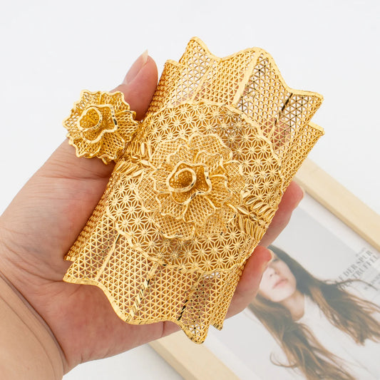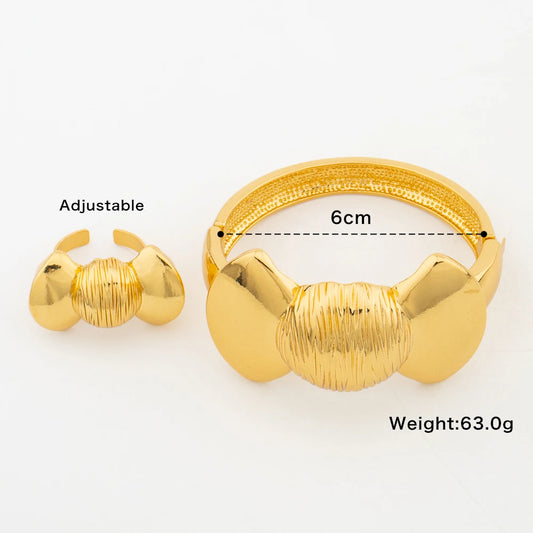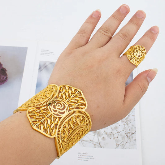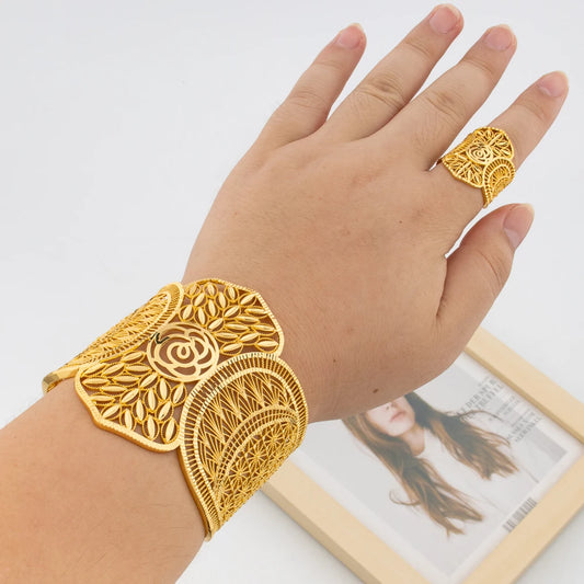 Golden Color Bangle and Ring Jewelry Set Large Size Cuff Bracelet and Ring Set