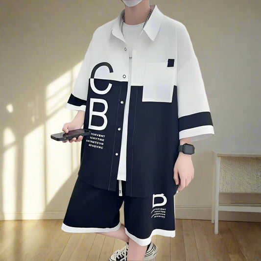 Short Sleeve Shirt and Shorts Pant, Korean Fashion Tracksuit for Men, Patchwork printing Joggers, 2 Piece Suit
