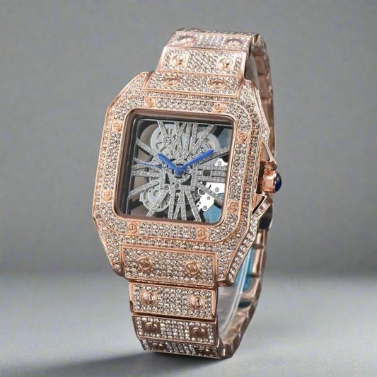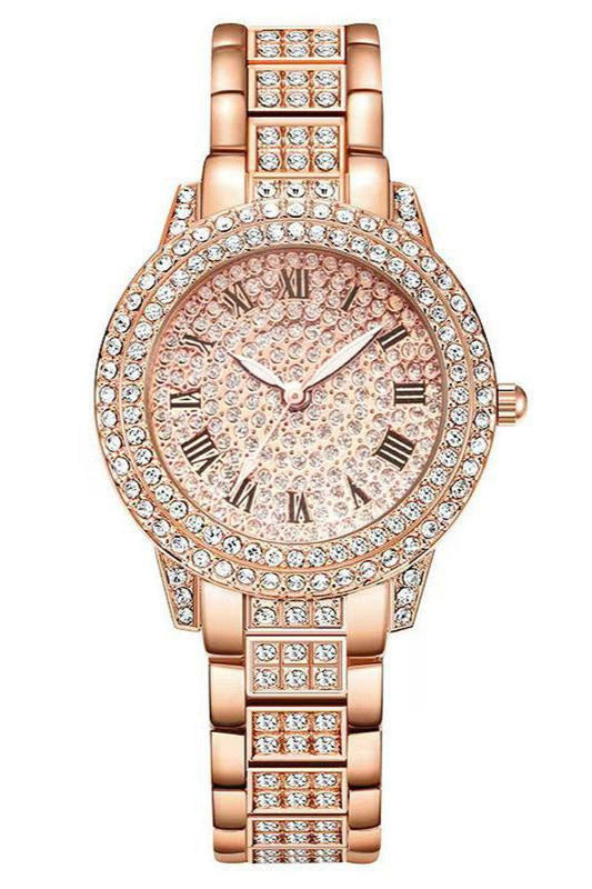 Roman Number Quartz Watch, Bracelet, Necklace, Earing, Ring 5pcs Set, Diamond Style