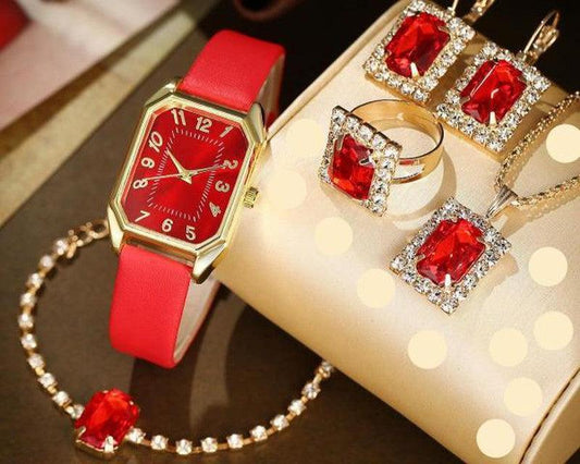 Square Quartz Watch Leather Belt Along With Matching Necklace and Earring Sets.